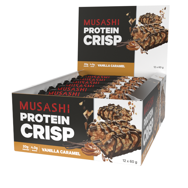 MUSASHI PROTEIN CRISP is the next evolution in the protein bar taste and sensation experience. A delicious and convenient bar loaded with 20g of high quality protein, and a unique combination of crispy and chunky pieces drizzled in milk chocolate.