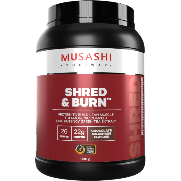 MUSASHI SHRED AND BURN is an optimised protein powder providing a powerful blend of active ingredients designed to support lean muscle goals. MUSASHI SHRED AND BURN is scientifically formulated using Whey protein Concentrate and Whey Protein Isolate in an advanced muscle shredding complex. This lean muscle formula is enhanced with key SHRED AND BURN ingredients: L-carnitine and Green Tea extract to support your goals in a delicious formula that tastes great and mixes with ease.